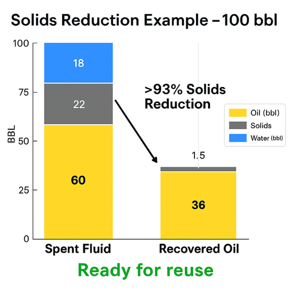 Recovered base oil value per 100 bbl of spent fluids and >$2000 in haul off and disposal costs from solids control enhancement.
